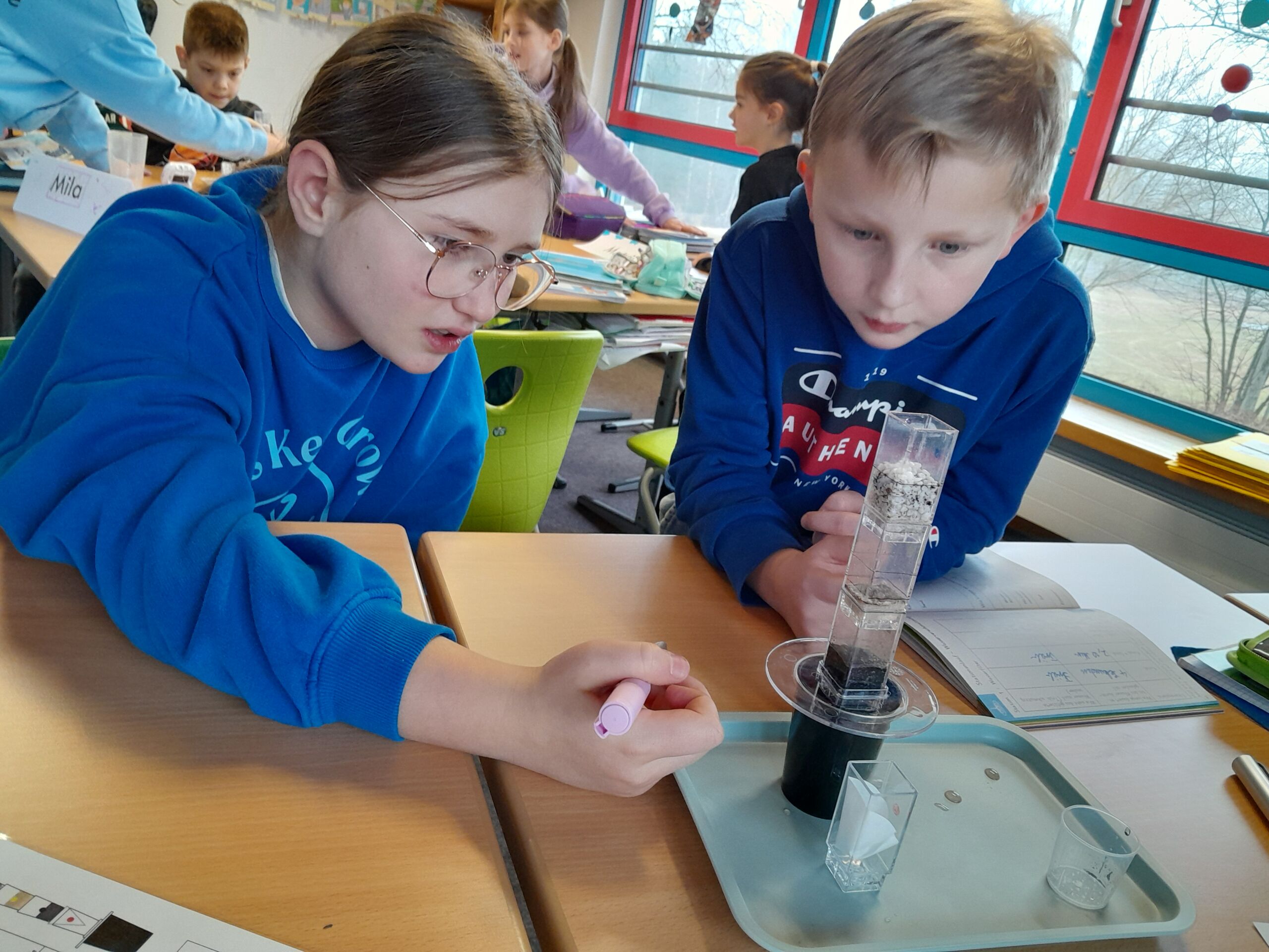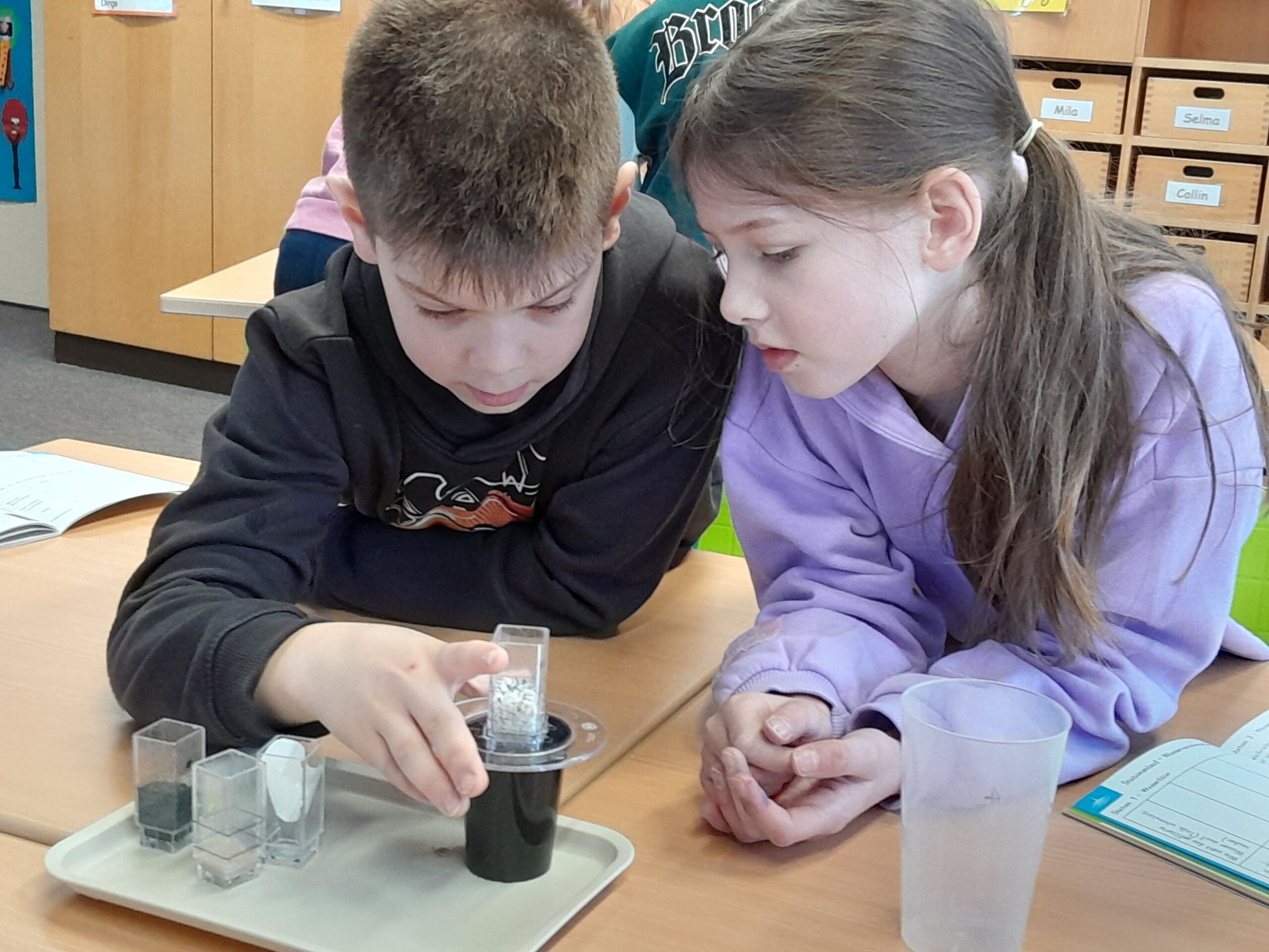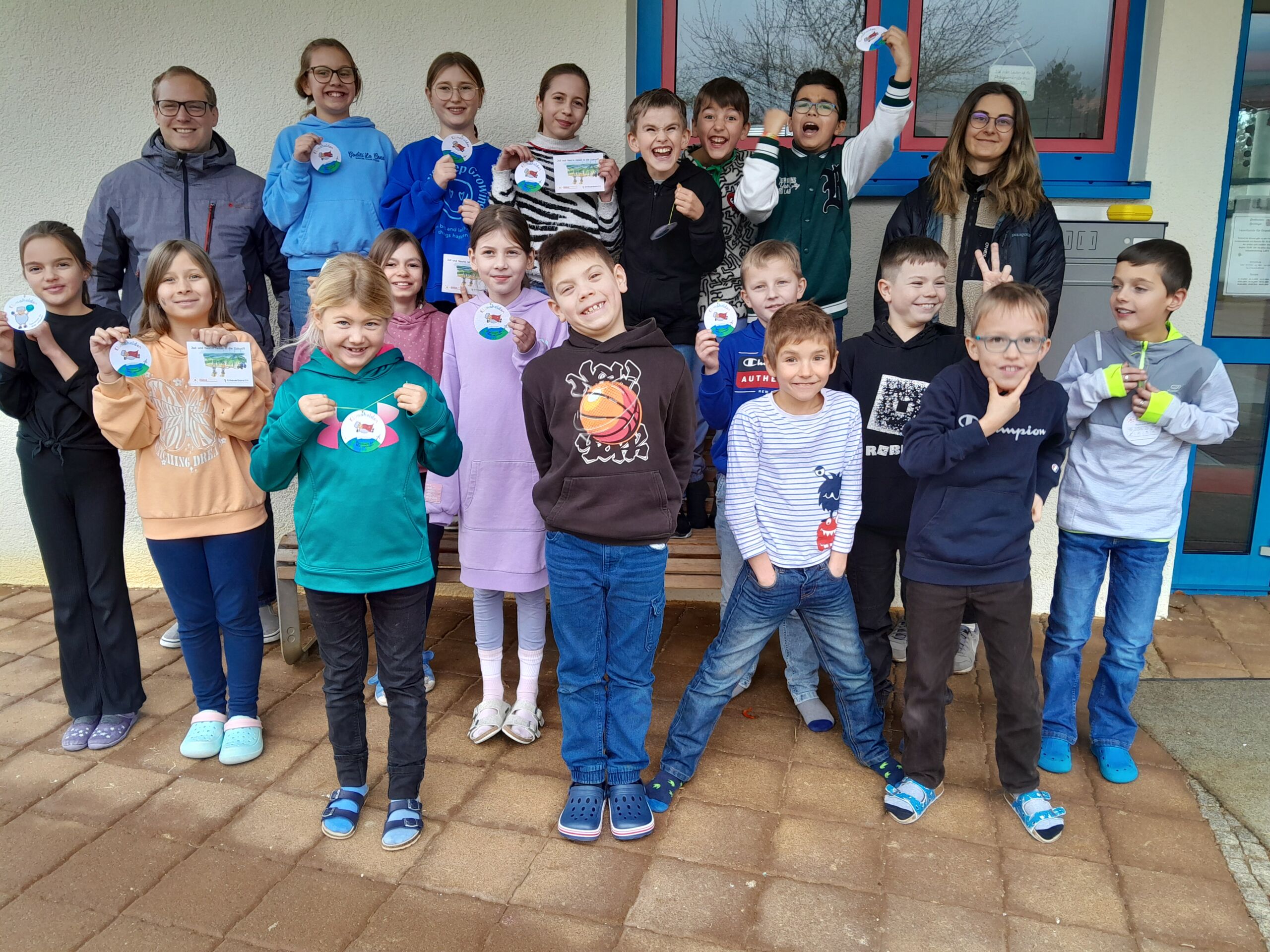 Im Rahmen der Unterrichtseinheit „Wetter und Klima“ erlebten die Dritt – und Viertklässler am Dienstag, 11. Februar 2025, ein Energie – und Klimaschutzprojekt mit der Energieagentur Schwarzwald – Baar – Heuberg. Nachdem das Vorwissen zu Klimawandel und Energieverbrauch spielerisch gesichert worden war, wurde in Teams ein spannendes Experiment zur Wasserfilterung durchgeführt und in einer Arbeitsmappe dokumentiert. Warum das Wasser der Ozeane steigt, konnten die Kinder bei einer Simulation zum Treibhauseffekt erkennen, doch was kann der Einzelne dagegen tun? Die Gedanken der Gruppen zu den Themen „Energie sparen“, „Umgang mit Wasser“, „Unterwegs“, „Konsum“, „Essen“, „Müll“ wurden gesammelt und präsentiert. Herr König und Frau Geiger, die Referenten der Energieagentur, verabschiedeten sich nach diesem Projekttag mit einer Plakette und einem Info-Büchlein von den begeisterten „Klimahelden“!