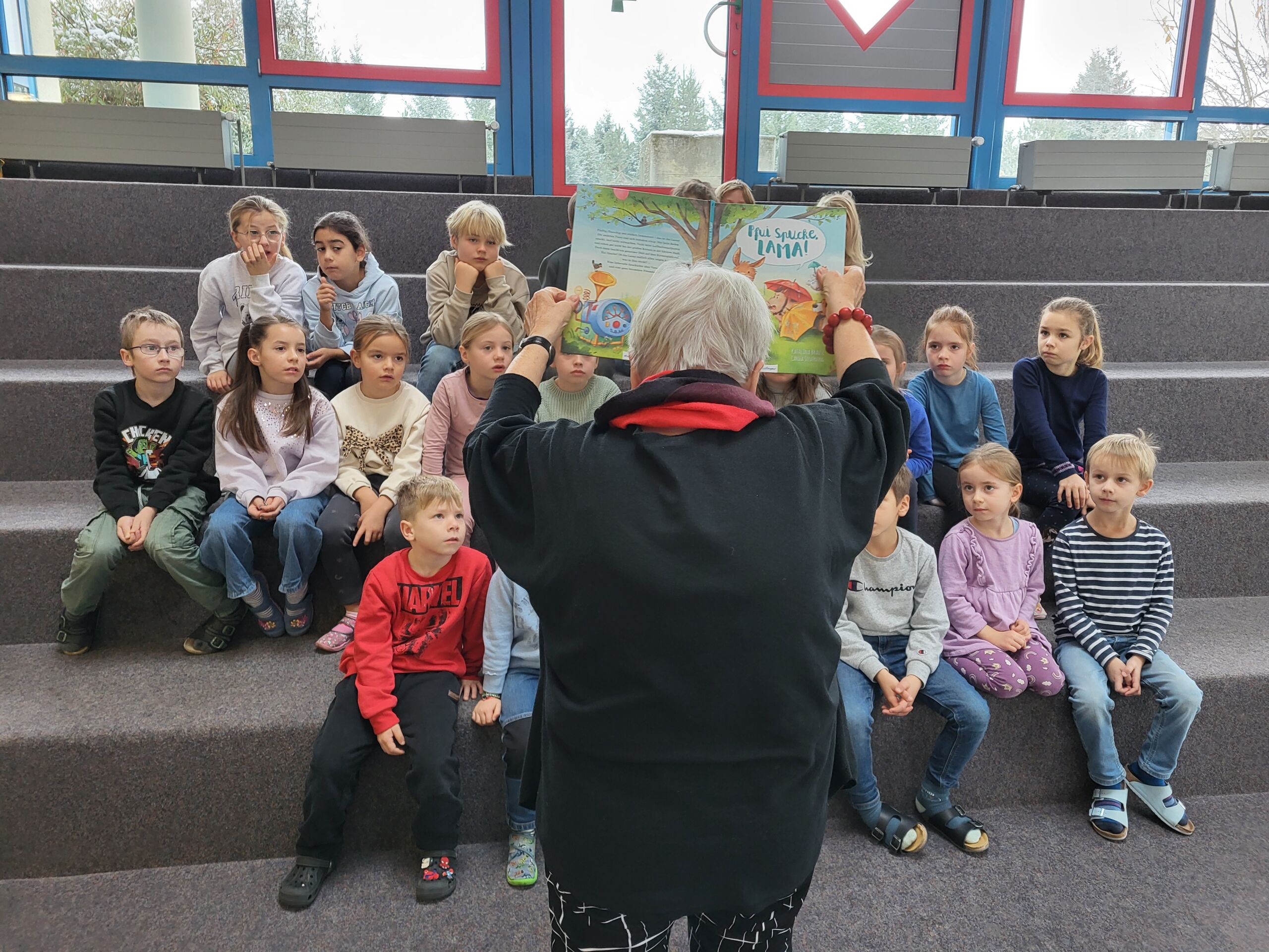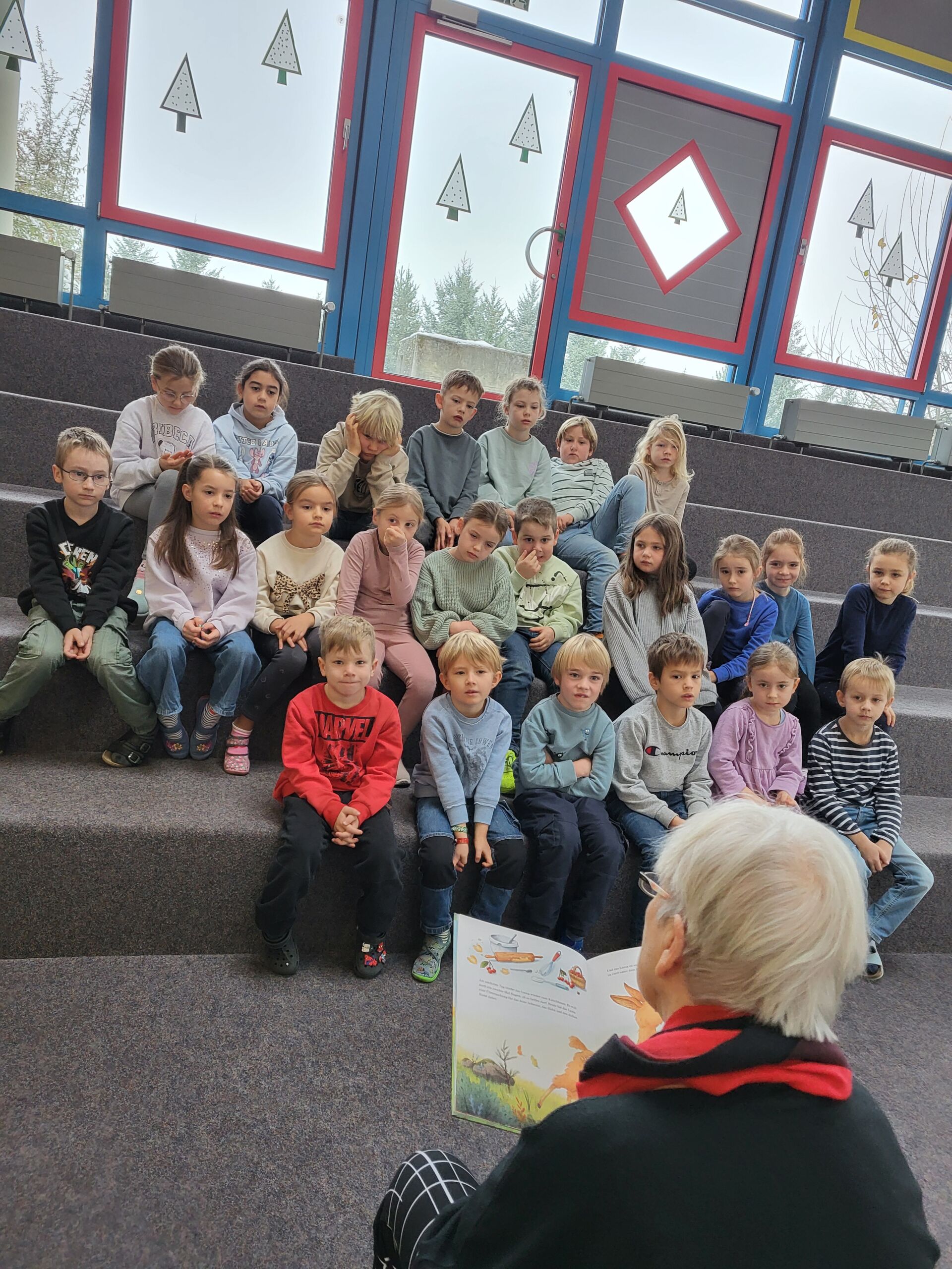 Mit viel Elan betrat Frau Bantle die Aula und ließ die Bücher mit vielfältigen Stimmen lebendig werden. Die Zuhörerinnen und Zuhörer lauschten gespannt und tauchten in bunt gestaltete Welten ein. Die Kinder waren begeistert. Nicht nur die Kinder der Eingangsstufe kamen in den Genuss des Vorlesens. Auch die Vorschüler aus Hausen wurden eingeladen, um in die Welt der Geschichten einzutauchen.