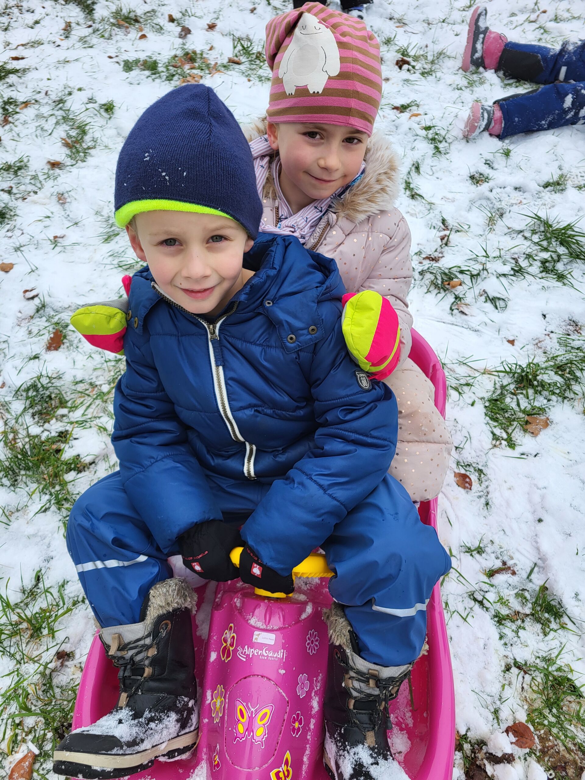 Nach dem Vorlesen ging es sportlich weiter: In den Sportstunden wagten sich die Kinder bei frischem Schnee nach draußen zum Rodeln und genossen die winterliche Landschaft.